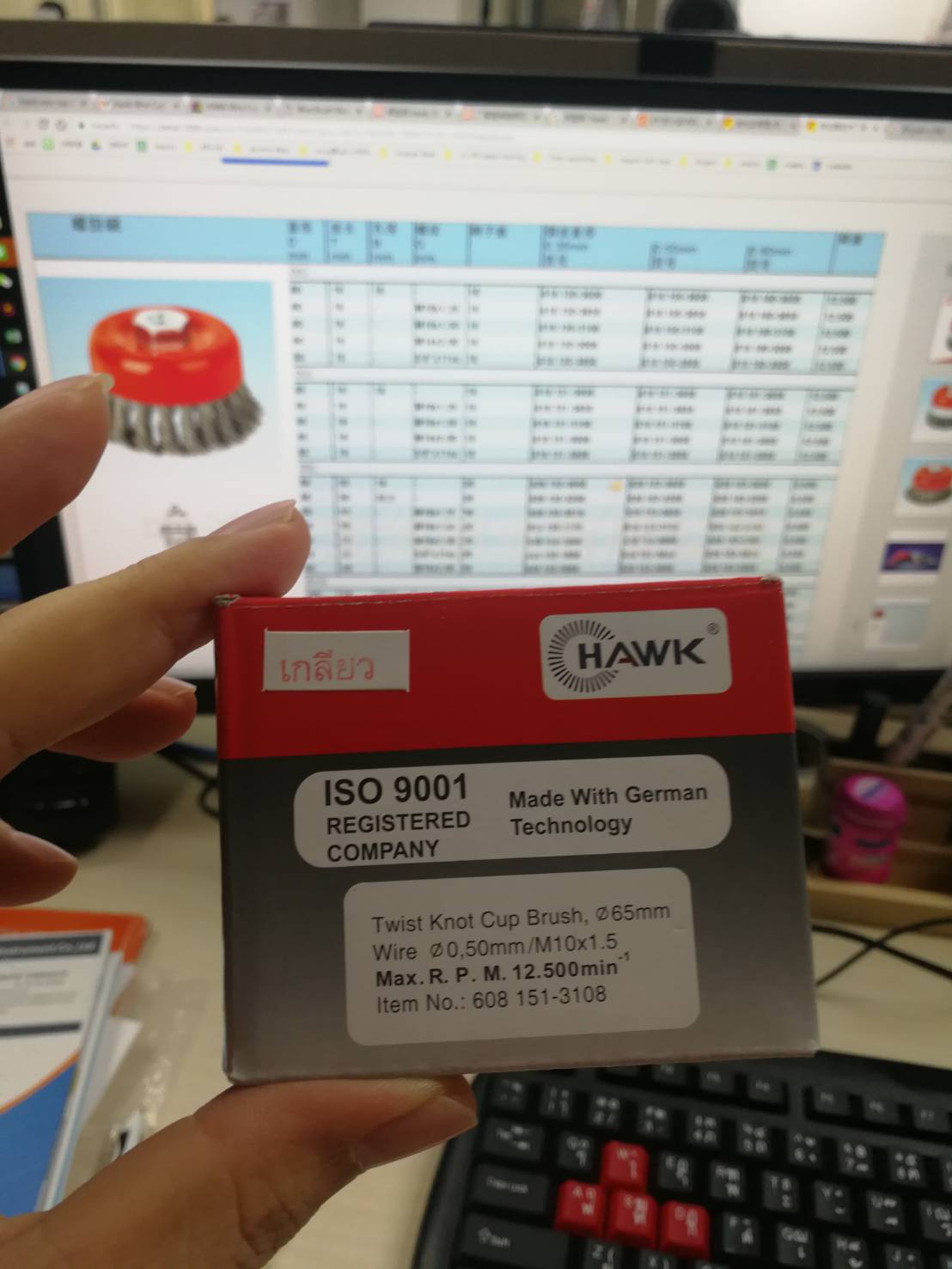 May 14, 2018ขาย แปรงลวดถ้วย ถักเปีย ยี่ห้อ Hawk ขนาด 65มม. ราคา 155 บาท/ลูก ; Hawk เป็นเครื่องหมาการค้าของผลิตภัณฑ์จากโรงงาน New Ningbo Industrial Power Brushes Co.,Ltd ประเทศจีน ประสพการณ์กว่า 20ปีในการผลิตและพัฒนาแปรงลวดเพื่ออุตสาหกรรมต่างๆเพื่อใช้ในการขัดถูคราบดำ, สี, สนิมเหล็ก ขัดเงาโลหะอื่นๆ ผลิตภัณฑ์ Hawk มีคุณภาพสูงผลิตด้วยเทคโนโลยี่จากประเทศเยอร์มันนี จึงเป็นที่ไว้วางใจ และให้ความเชื่อถือในคุณภาพผลิตภัณฑ์ Hawk สำหรับใช้งานในอุสาหกรรมต่างๆมานาน
